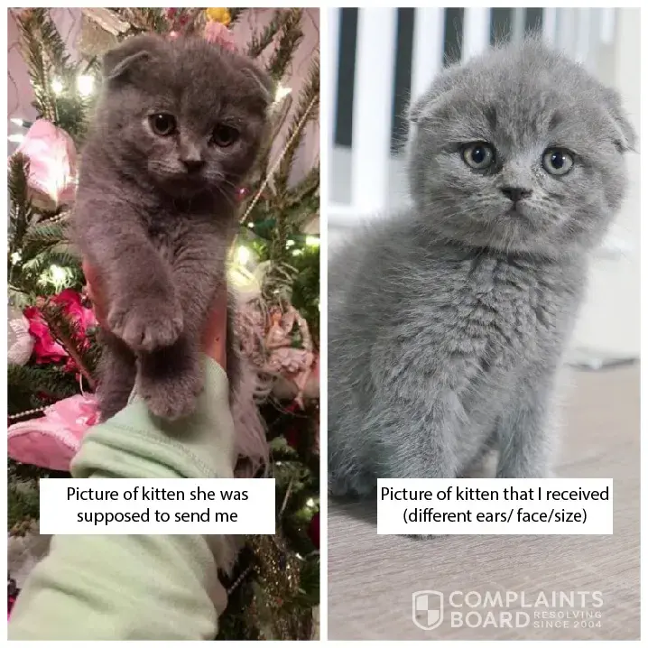 • sent me fake pictures and videos of my kitten (She has now taken down the post with the kitten she told me she sold but I took screenshots of everything *picture comparison attached (Her picture on the left, the kitten I received on the right)