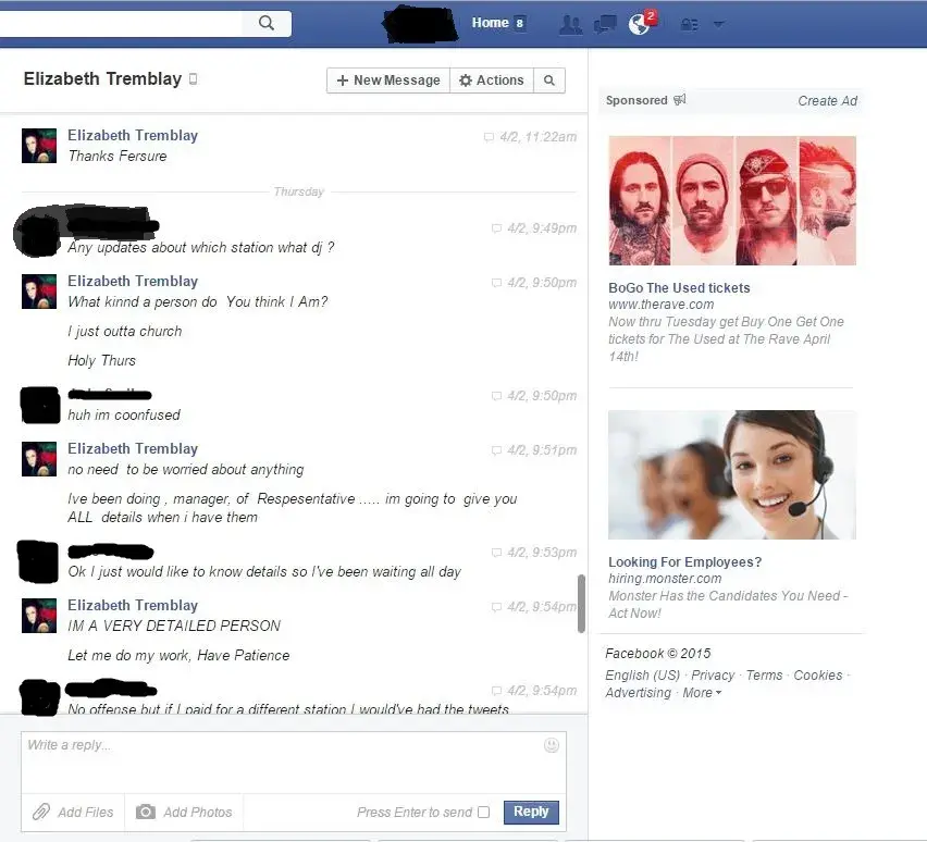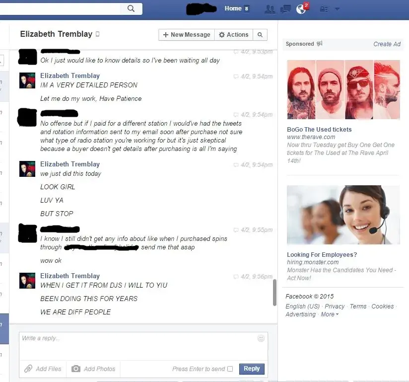 Elizabeth was paid 30 on April 2, 2015 For song submission for my artist for online radio airplay. Elizabeth Tremblay failed to deliver any details on what radio station, nor did she give my client an actual date and time for when there would be any radio airplay. When asked for specific details she got defensive and insulted. Elizabeth is not affiliated with any Professional Music Entities On or Offline and she is operating Scams Illegally over the Internet. She is not an A&R, She does not have any degree in what she Falsely represents on her Facebook, Facebook Like Page, nor Her linkedIn account. She has been reported to social media sites online for her Fraudulent Activities. She is Elizabeth Tremblay on Soundcloud, LinkedIn, and Twitter also I would watch out for her because she will trick you into wiring her money then never sending your song to any radio stations that she so call claims she has direct contact with. We're providing screenshots to prove that Elizabeth Tremblay is an Online Scam. Here are some photos provided and make sure any transactions you do are through paypal for anytime of online promotional and advertisement services it's a lot of Scammers Online desperate to take hard working people that make an honest living. What really is sour about this ordeal Elizabeth Tremblay knew my client online a few years prior to my client trusting her to deliver what she advertises online. This Report is made to protect other individuals from making similar mistakes.