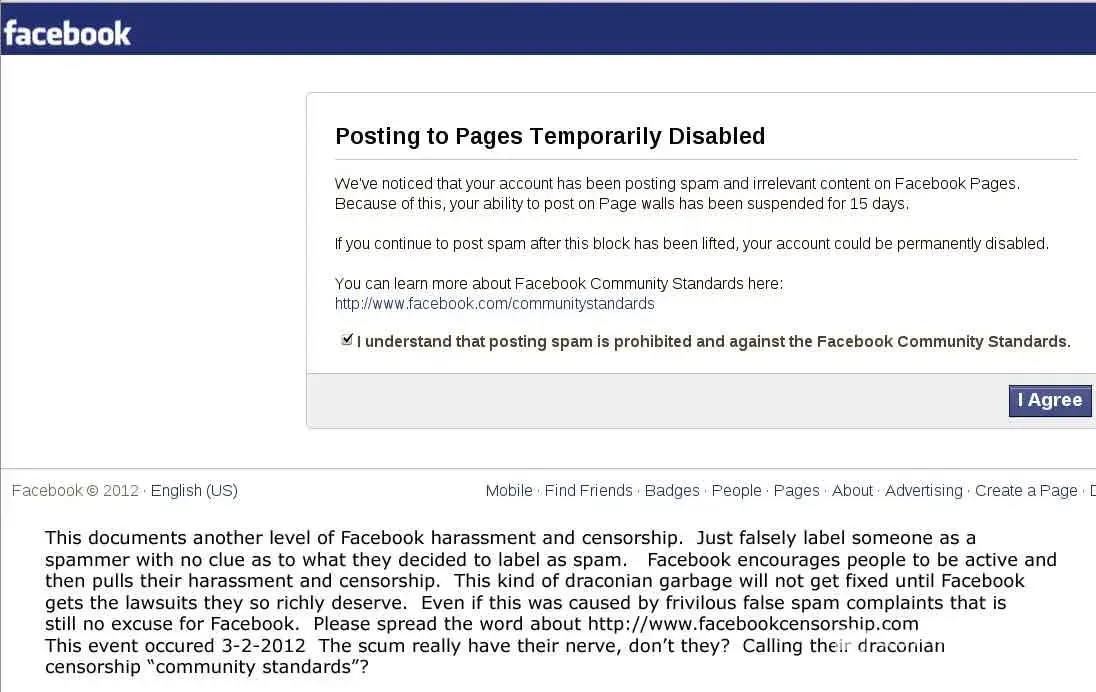 Update 3-2-2012 Facebook has falsely labeled me as a spammer and blocked my from posting to pages even knowing that I am the victim of campaigns of frivolous complaints and harassment. I am convinced that nothing short of lawsuits and/or a mass exodus from Facebook will clean up their mess. Please spread the word about