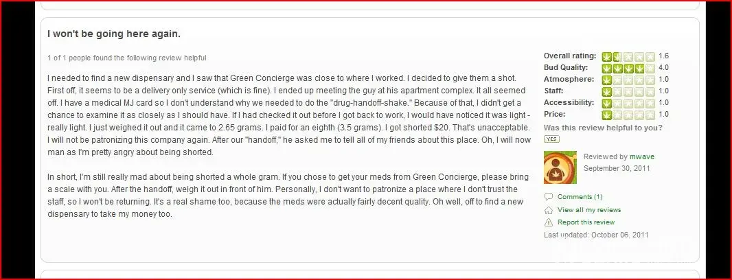mwave wrote this on September 30, 2011 "I needed to find a new dispensary and I saw that Green Concierge was close to where I worked. I decided to give them a shot. First off, it seems to be a delivery only service (which is fine). I ended up meeting the guy at his apartment complex. It all seemed off. I have a medical MJ card so I don't understand why we needed to do the "drug-handoff-shake.""