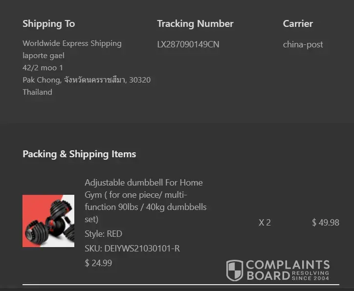 A few months ago i ordered two adjustable dumbbells online. I received (after 5 weeks) a cheap pair of sunglasses that worth maybe 1 Dollar, i directly contacted the company via email and they said sorry for the wrong shipment and promised me to send the product as soon as possible but i did not receive anything as promised, i sent another message to complain and they answered for the second and last time to tell me that i will receive it in 4 to 5 weeks and they now don't answer my messages !