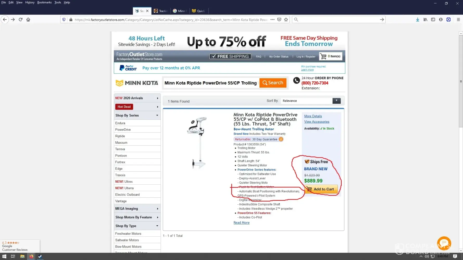 I was researching and looking at trolling motors for my boat and came across this website advertising 75% off and same day shipping. The price was ridiculously cheaper than other online retailers, which were also sold out/back ordered. I decided to try it out and ordered the advertised trolling motor with iPilot (see attached photos). However when the product arrived, it was a much cheaper (actual price of what I paid for the 75% off item) model. It works, and everything is ok there, just hate being lied to and misled like that on the advertising. Guess I learned my lesson. Will never buy from this website/outlet again and highly recommend no one else do it in the future.