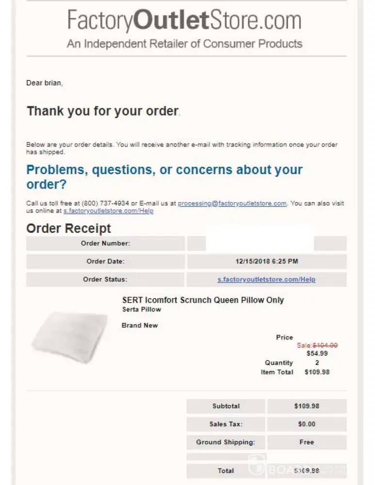 I ordered two pillows from this company and 1 month later the product has not even been shipped. I emailed the company 3 times to check in on the status of my order and received no response from this company. This company provides absolutely no service and is a waste of your time and money! Worst experience I have ever had working with an online retailer or any retailer in fact! Do not order from factoryoutletstore.com! Rating = (-10)!