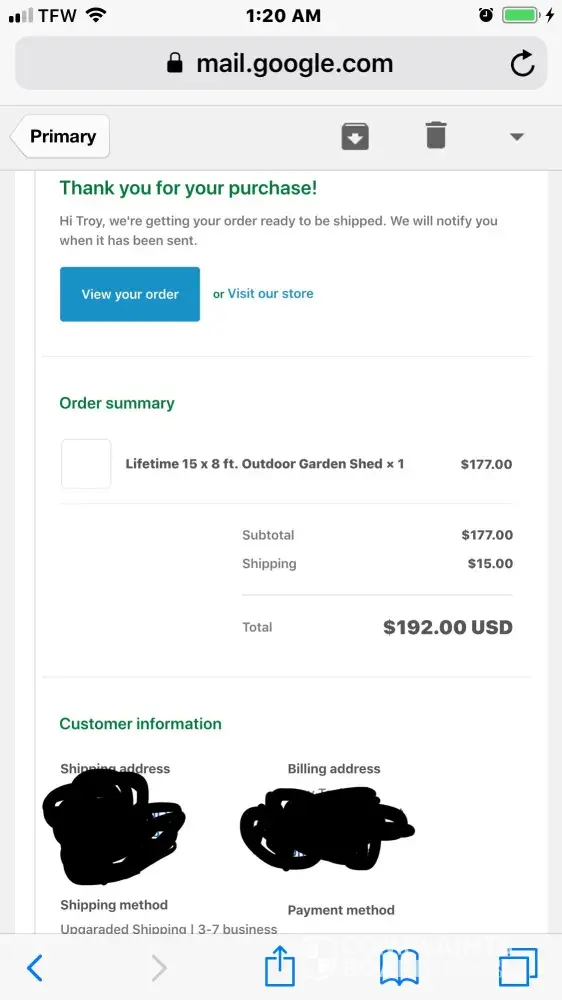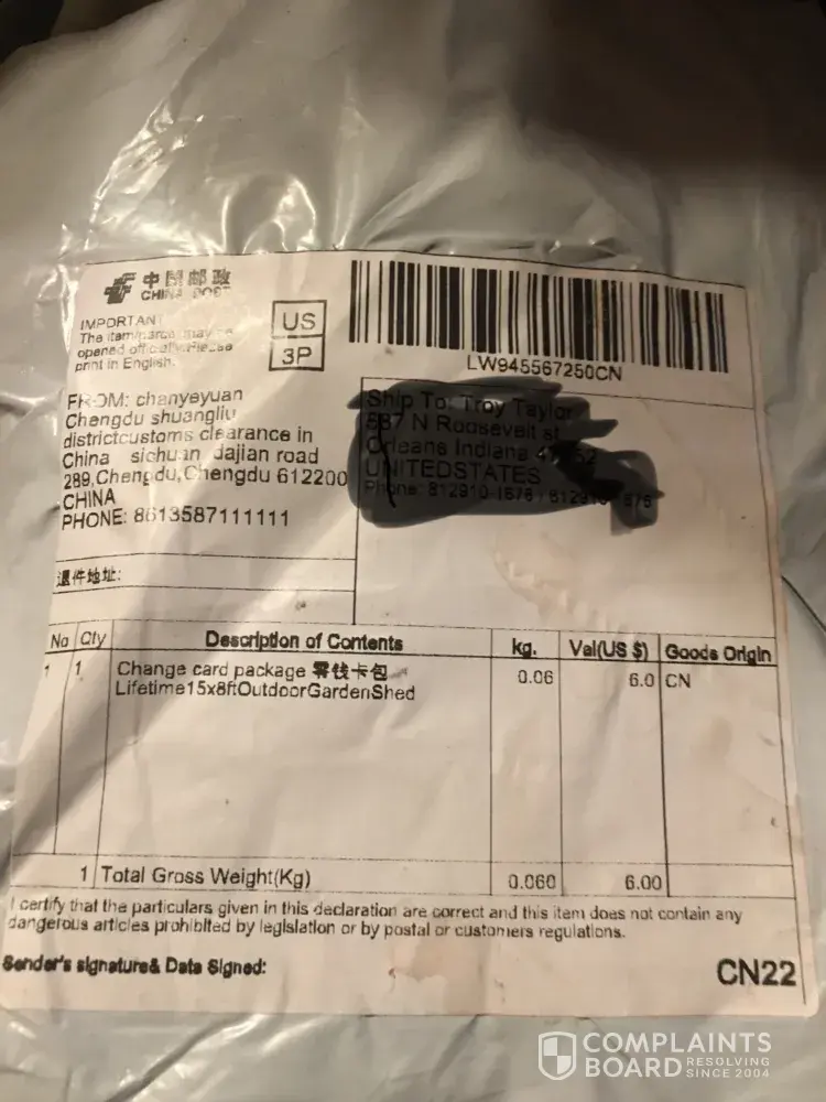 I bought a shed for $178 plus $15 for faster shipping and I received a package from them with a credit card holder, The web sight is - soiefugh.win.shopify.com - this was a ad on the oh So famous from scams Facebook (market place) . If you go to Scam Doc you will find out a lot of the info like phone numbers and real addresses where the domain name came from and more.