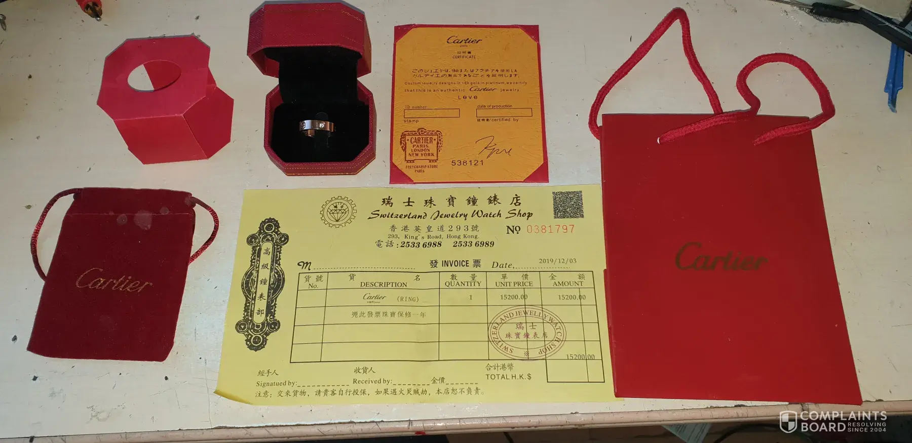 Hi guys, the same happened to me! I got this fake Cartier ring mid December 2020 purchased for $15, 200 at the Switzerland Jewelry Watch Shop in Hong Kong. The phone number is fake and doesn't exist. A friend of mine from HK tried calling the number. I suspected scammers opened up a credit card Online on my name to make this purchase. So far nobody (bank) came forward to ask for money. The receipt looks exactly the same as Ralph Snerd attached. Please let me know if you discover anything else.