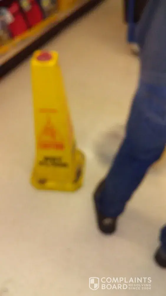 I was a customer in your store on 9-14 2017 I was headed to the checkout counter I saw a yellow spill sign over to my right over a large puddle of chemical of some sort I proceeded to head to counter there was no sign over where I was walking however the spill apparently splattered a thin line he didn't see as I walked I slept on the chemical that was splattered I fell hitting my left four leg on the cards right leg bending behind me as I fell to my knee however there was two employees that came to help me up there was a third employee behind me unpacking boxes I spoke to manager she called the district manager they gave me a number to call I called as soon as I left the store which the call was never answered so I called again once I got home I stayed on that phone call for about an hour call was never answered so I did online complaint