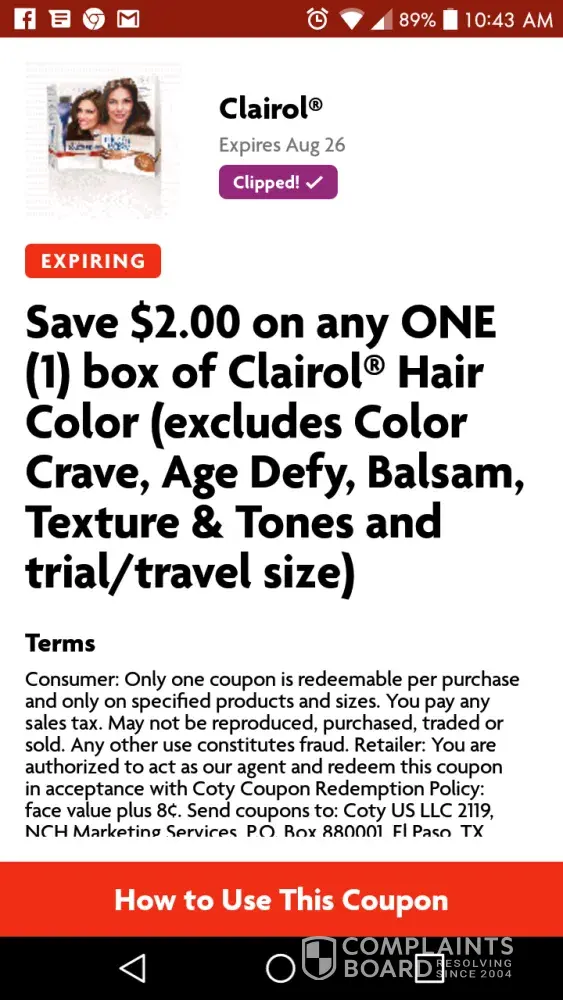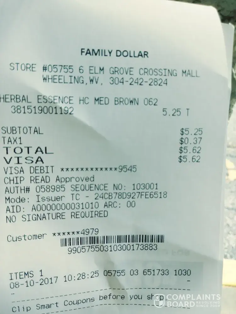 I stopped at Family Dollar store in the Elm Grove Crossing Mall in Wheeling, WV today to pick up this hair dye because I had a Smart Coupon for $2.00 off of Clairol hair dye and when I checked out, it was pit in the system as "Herbal Essence" hair dye when in fact it's Clairol, it has Clairol in big, capital silver/gray letters actossed the top of tge front if the box. When I called the cashier on it, she first tried arguing that it waa Herbal Essence so I pulled the box out of the bag and pointed to the big gray capiral letters spelling CLAIROL acrossed the top of the box, the she preceded to tell me there is nothing she can do! I stood in the isle with hair dye looking at every single one of them making sure the coupon details did not say excluding Herbal color and it did not! This is the only reason I had stopped at Family Dollar this morning, to get one thing that I knew I had the smart coupon for. Can you please give me a reason why I had to argue and prove to the cashier that the product I was buying was in fact supposed to give me a $2.00 off discount and that there was nothing to be done! I would at leaat like the $2.00 off!