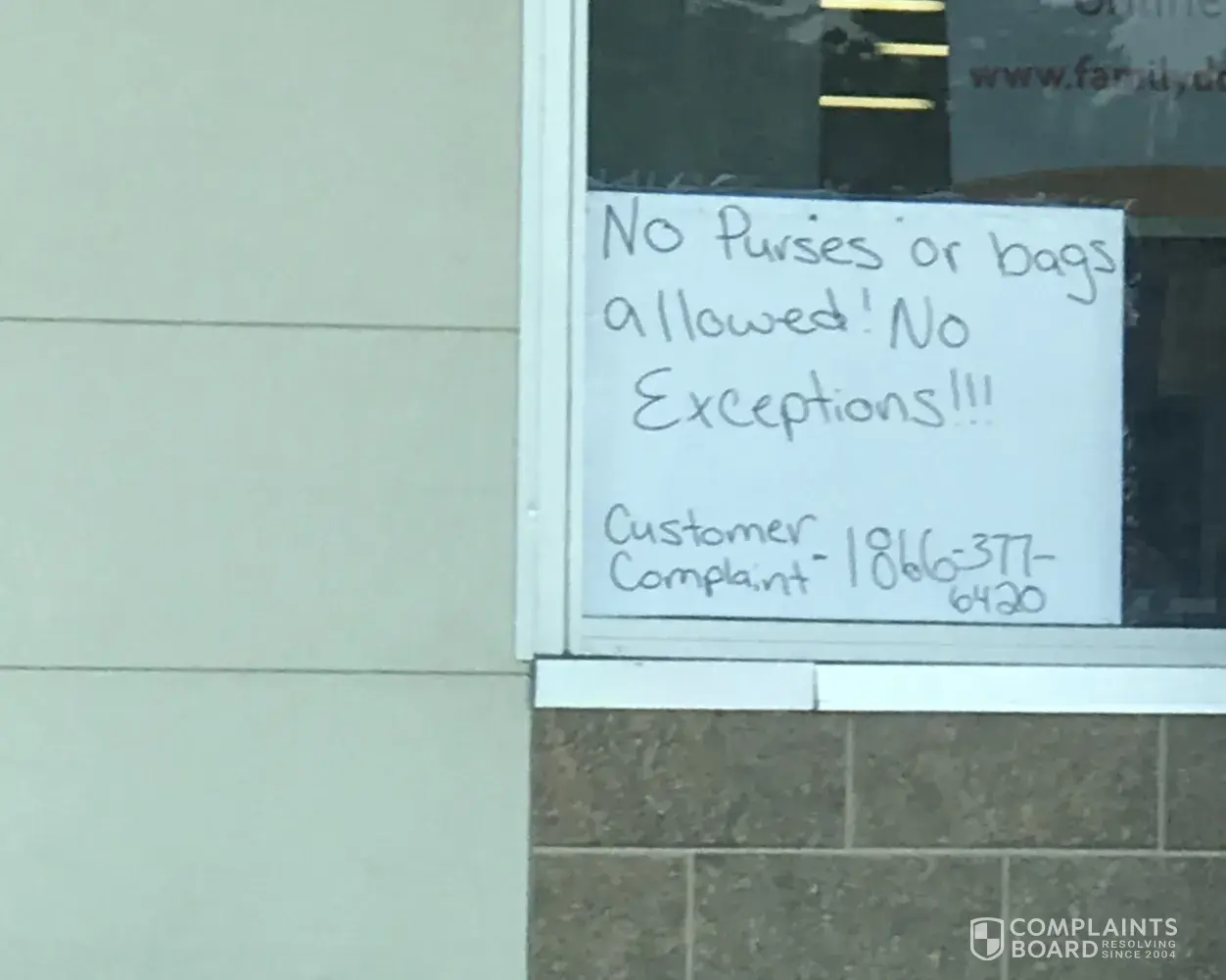 I went to this Family Dollar yesterday and as I was entering the store 2 employees were standing outside. One smoking and the other talking to the employee smoking. I was told I was not allowed to enter the store with my purse! Now mind you the purse I had was not oversized or by no way looked empty! I asked the employee why this is so! I've never heard of...