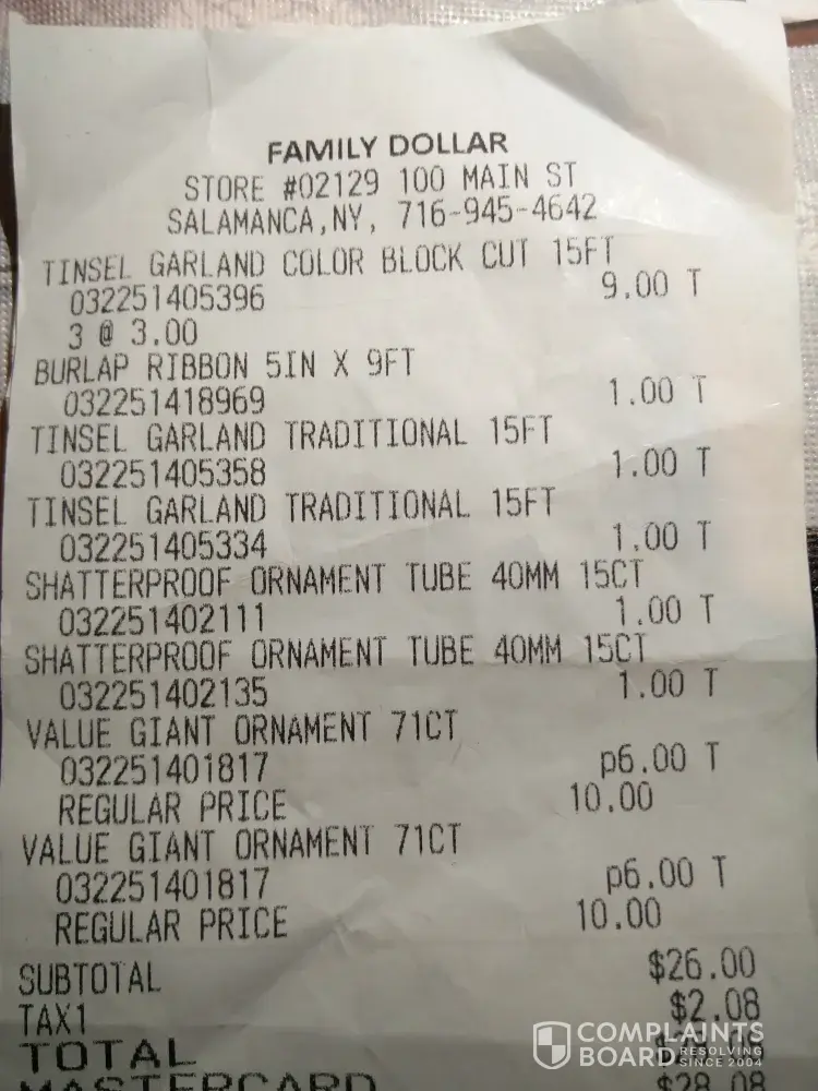 I purchased a Christmas tree from family dollar northern lights columbus oh. When i opened the box 2 weeks later part of the base was missing. When i tried to exchange it i was denied because i had thrown the reciept away . i didnt know i was going to need it. I had not planned to have to take it back to the store. I had to purchase another tree. This is absolutely not right, now im out more money because of a default in your product. There should have been nothing wrong with trying to exchange a default product for one that was right. Now i feel that i should be compensated for your faulty product which was not my intent . i just wanted what i paid for. Because of this and the rude behavior ive witnessed by your managers i will no longer shop at family dollar. A franchise i have faithfully shopped at in several different towns and states. Your columbus oh stores are the most poorly managed stores ive ever encountered.
