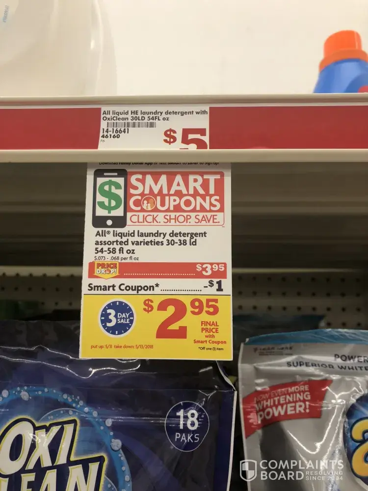 I went in my local family dollar in which I buy a lot of my laundry detergent. I specifically saw a sale sign on All brand laundry detergent stating the sale price was 395 minus the one dollar digital coupon with a balance of 295. I went and paid my bill went out to my car and checked the receipt and it rang up five dollars with one dollar digital coupon leaving the amount I paid four dollars. I took it back in the store showed the Cashier and he said oh the sign just was never taken down but that has expired. It expired on May 13 2018 & today is May 20, 2018. He then proceeded to tell me there was nothing he could do about it because his manager would Yellit him for doing it. He had to go by what was on the sale ticket, now it's not my fault that the sign wasn't taken down. I'm pretty upset because I go in there often to buy things but this is a big turn off even though it's only a dollar and some change it's not the point I am a single mom I have a disabled child to every penny counts so I doubt I will be going back to Family Dollar to shop. It's just ridiculous that a manager would yell at someone for their Mistake and furthermore cannot satisfy a customer, terrible customer service in that store meaning the manager the man behind the cashier counter he couldn't do anything about it wasn't his fault