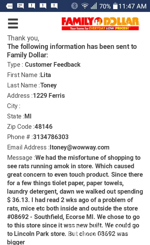 Someone has either hacked my Facebook account, and possibly Family Dollar's network as well. I am the person who submitted the original complaint on Me Loveless. I have not attempted to remove the complaint or alter it. But obviously Someone has! And by reading the comments, it seems as tho they also wish to discredit myself so that it would appear the complaint lacks credibility. Which should also concern someone that a complaint may be altered and the system manipulated. I can only assume that this was done in an attempt to retain or transfer the employee. Not of any concern to me. My concern was only to report the violation, and now to find out how my Facebook account has been compromised and by whom. The truth is in the video that I will repost.