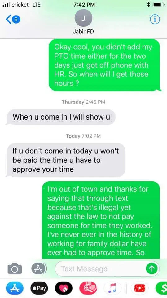 Then Jabir ends up taking time from me out the system which I worked and owes me 16 hrs + for PTO time so he says I have to come in and approve my time or I'm not getting laid which I have never ever done before while working with Family Dollar!