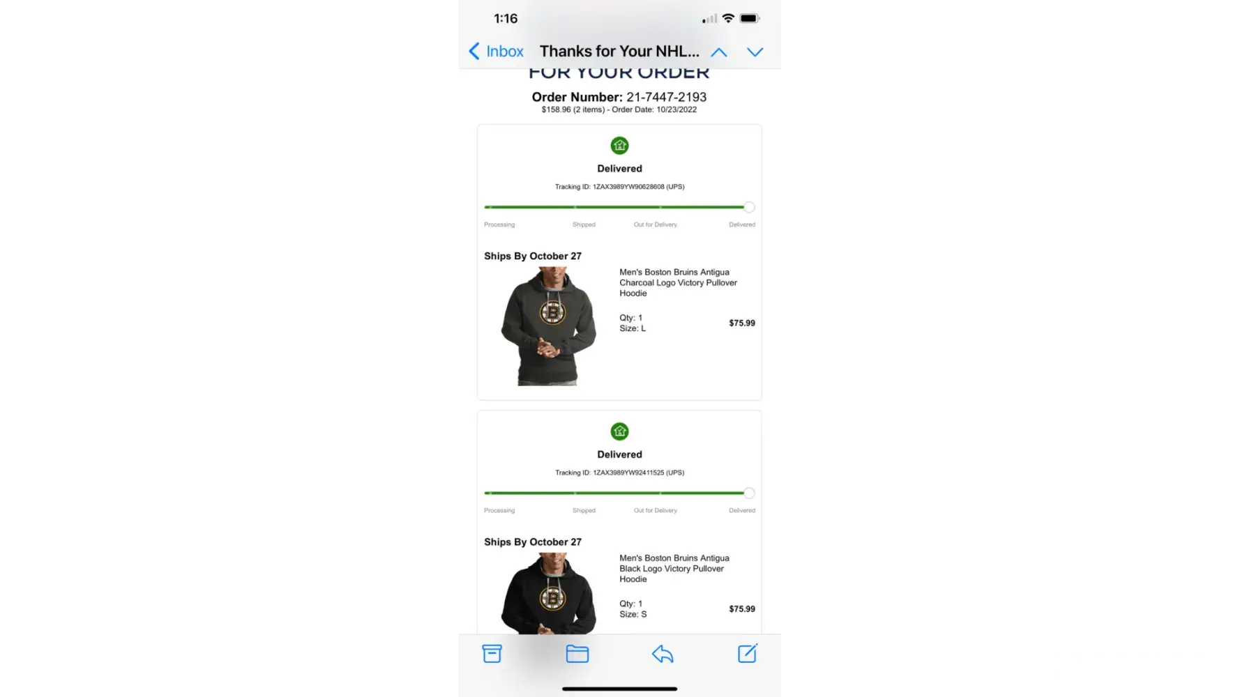 I bought a hoodie in the beginning of December as a gift. After a few weeks and no hoodie, I went to track the product. The Fanatics website said they could not find my order number. When I e-mailed the company, I got no response. Phone number provided didn't work.