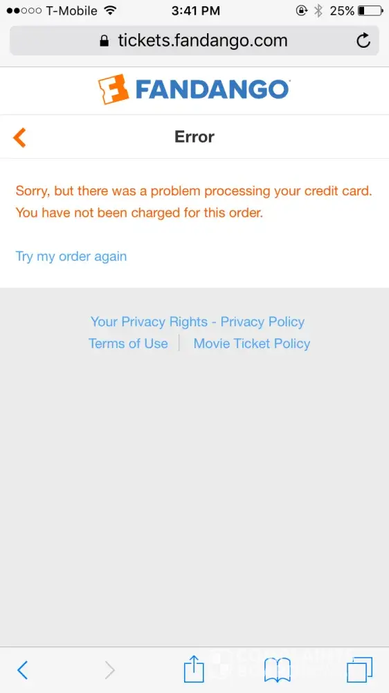 I tried buying movie tickets through fandango website but everytime I was done it said error, I tried twice, so both times I was charged but I received no email or tickets, they still took my money. I called and told them about the problem and they just left me on hold. I want my money back, it's like 60$.. my card still says processing but the 60$ aren't available, they actually removed them from my total balance & i didn't even get my tickets. I just want my money back