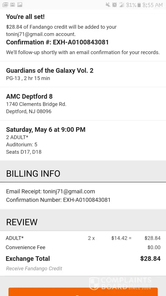 I received a Fandango gift card as a birthday gift and proceeded to purchase two tickets to see Rogue One: A Star Wars Story playing at a local theater on January 14, 2017.