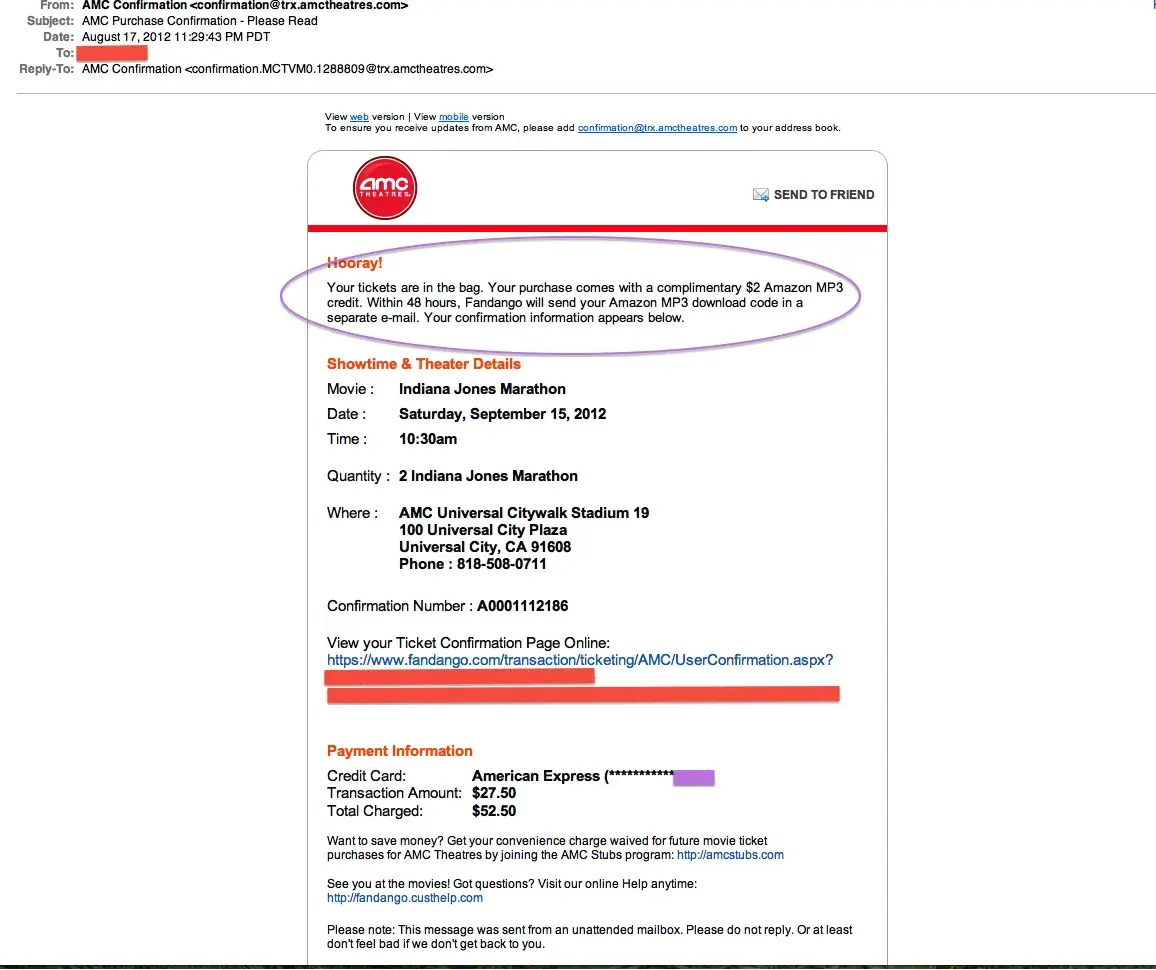 They immediately after sent me an email stating, "Your tickets are in the bag. Your purchase comes with a complimentary $2 Amazon MP3 credit. Within 48 hours, Fandango will send your Amazon MP3 download code in a separate e-mail. Your confirmation information appears below."