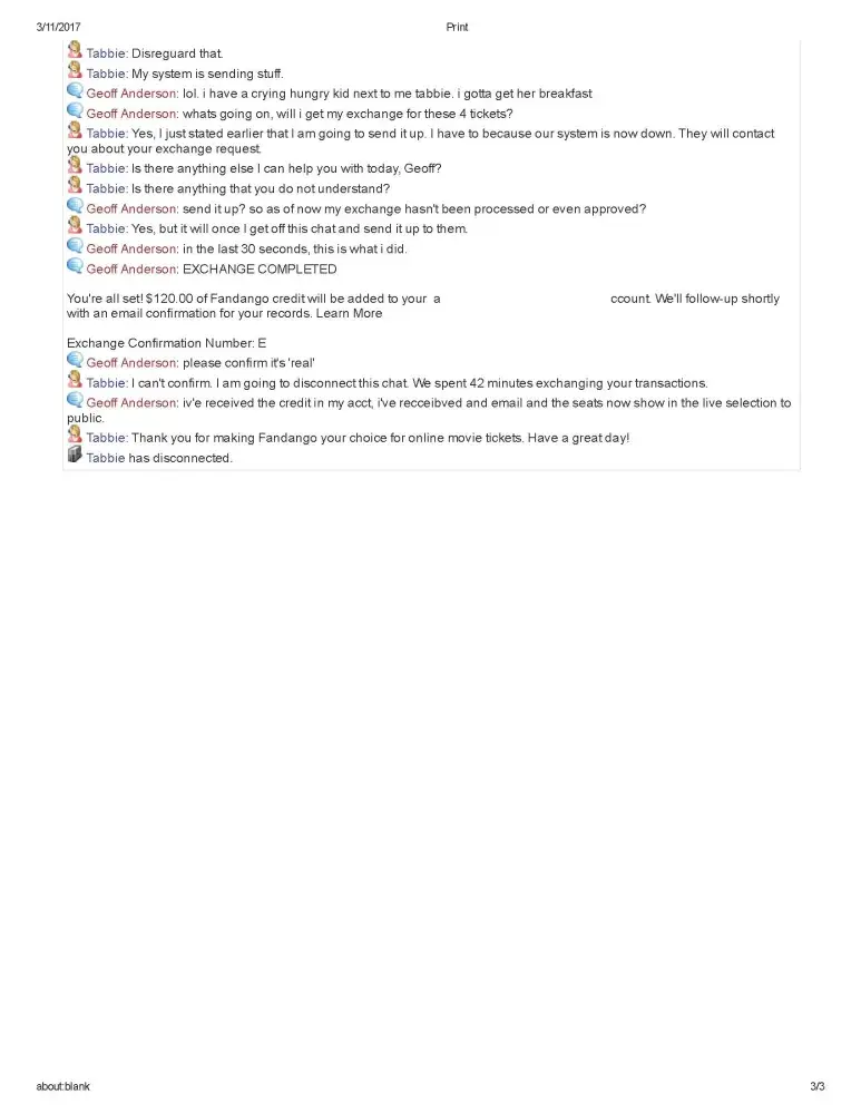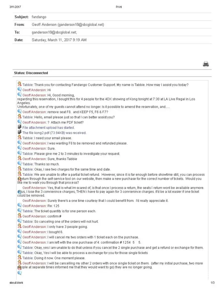Go ahead and save their stupid "convenience charge" and drive to the theater yourself. Fandango is a waste of time, money, and any problems you have will never be resolved.