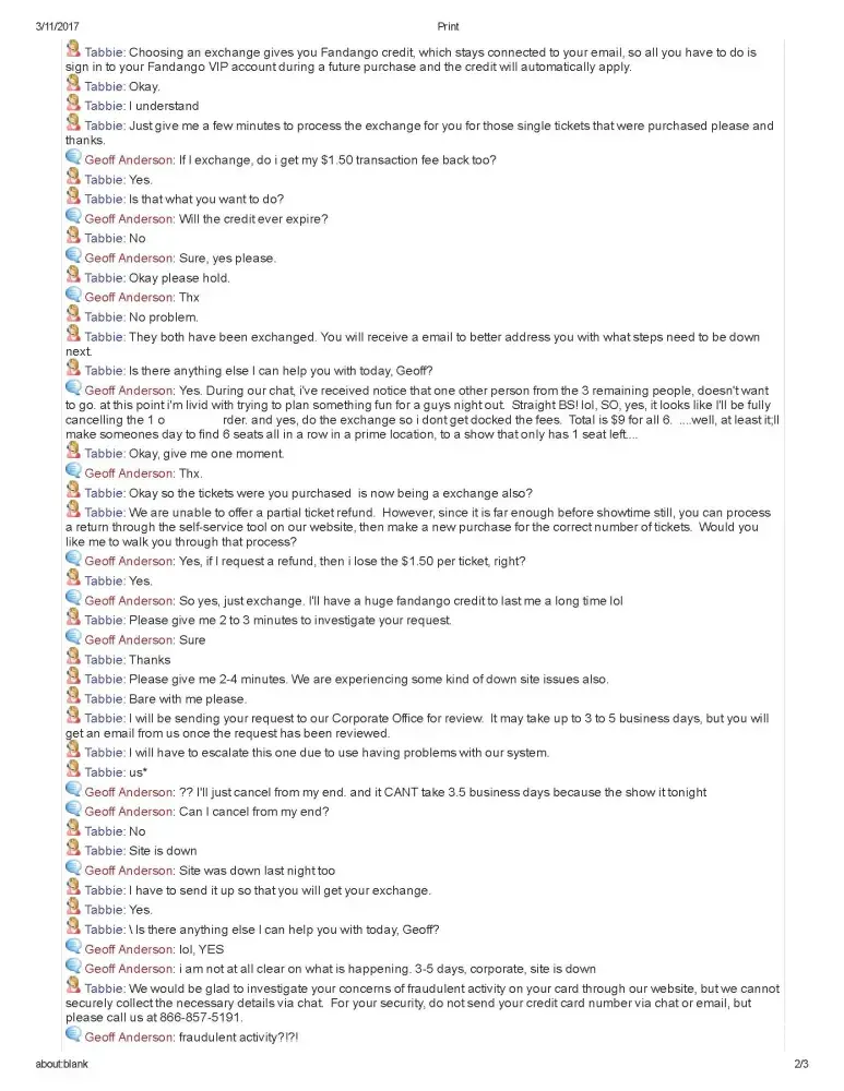 Don't ever use Fandango...they are ok sometimes, but no I realize they make mistakes and if you want them corrected, you will never get anyone to actually fix it, your stuck and they don't care.