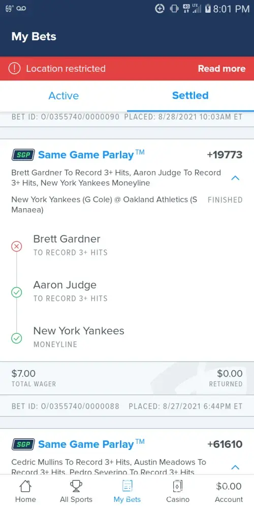 I been a member of fanduel I placed 3 bets and never was paid plus they stole my 100,000 from my account I called them to resolve they ended up banning me from the app and all meadowlands I been having issues with this app for a while I would never think they will steal my money and not pay me on winners. I contacted the ftc and attorney general also.