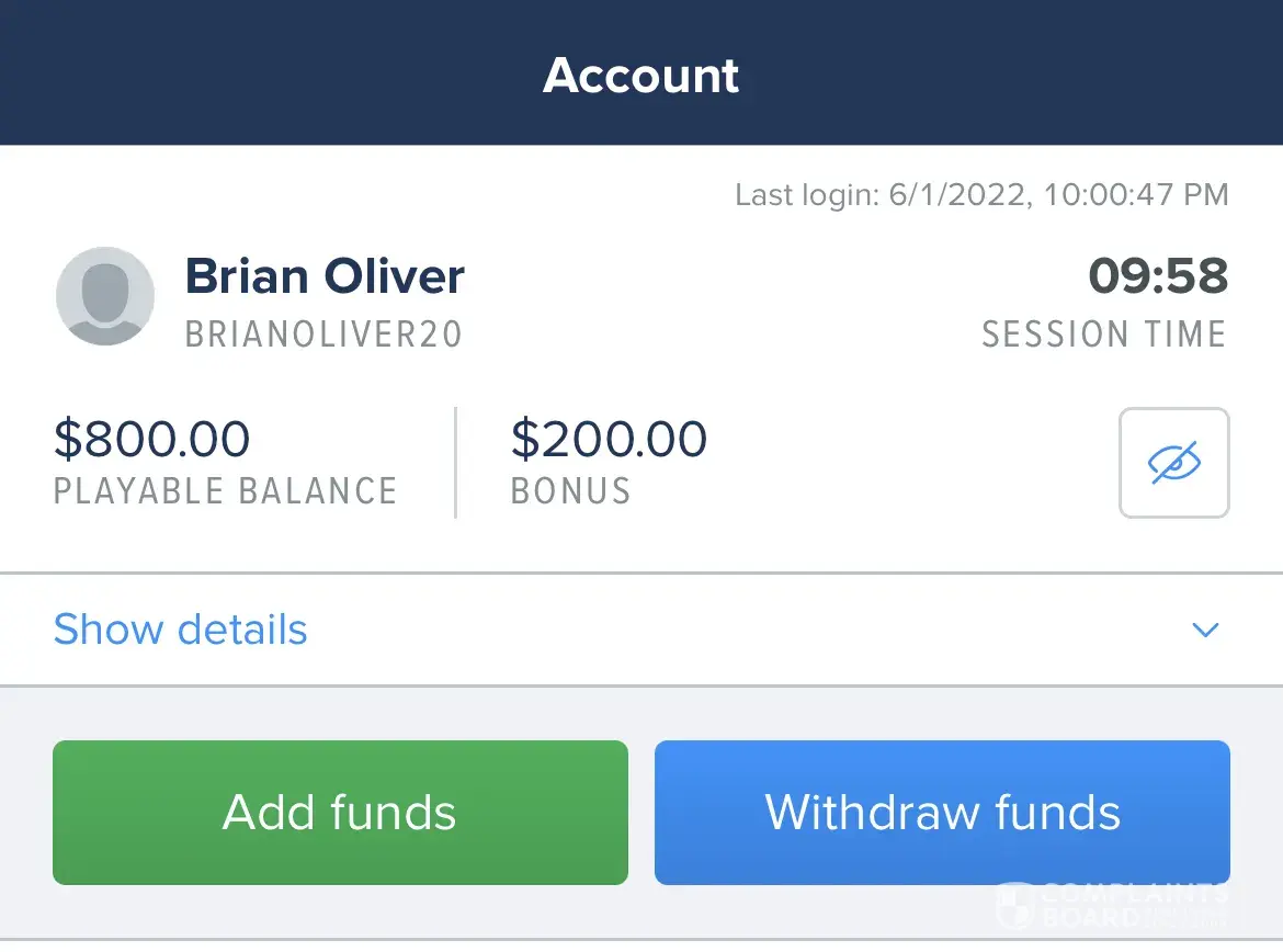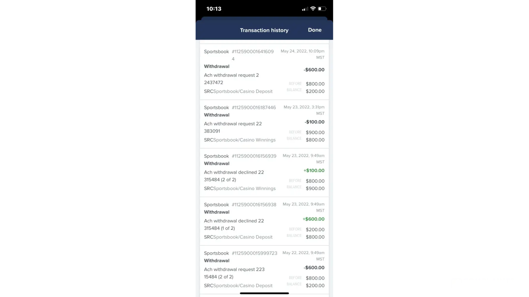May 24, 2022: $600 withdrawal declined by FanDuel