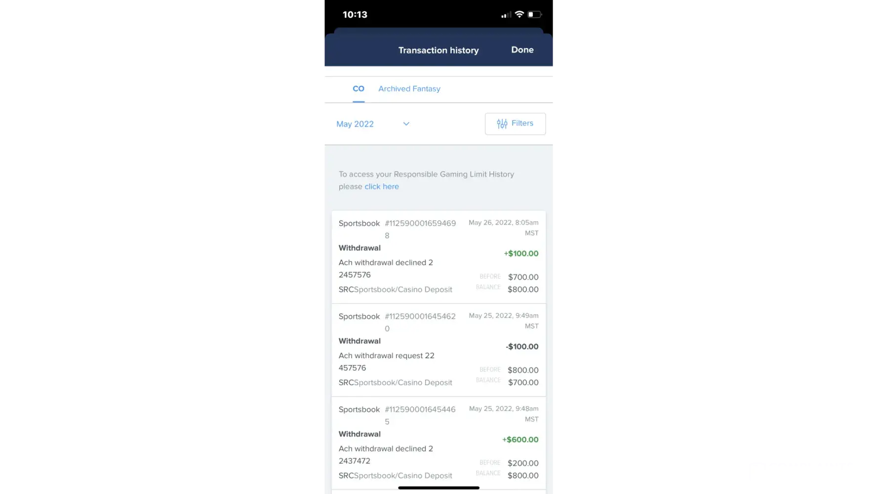May 25, 2022: $100 withdrawal declined by FanDuel