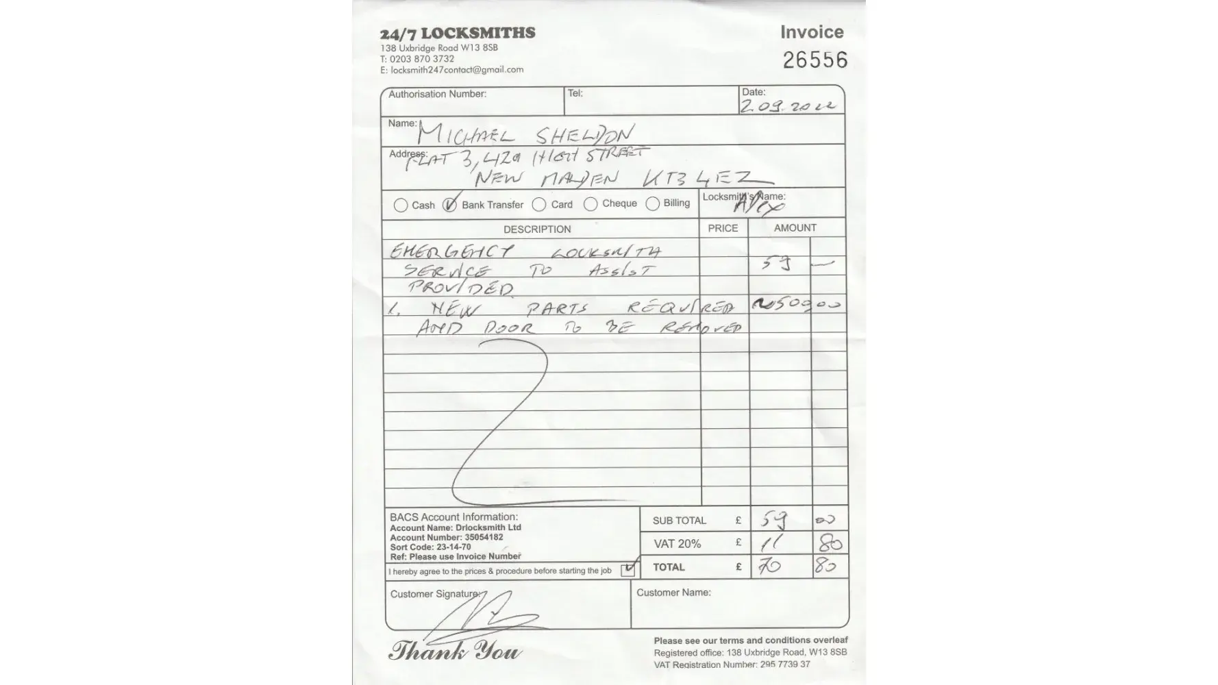 On his arrival he proceeded to assess the issue. I realised that only the front entry door was at fault as the second door functioned properly and I informed him of this. The inspection took at most 10 minutes and the locksmith concluded that I needed a spare part (which he did not carry with him despite my expectation that he would be fully equipped). The job was costed at £500. No mention of VAT which would have meant a total layout of £600.