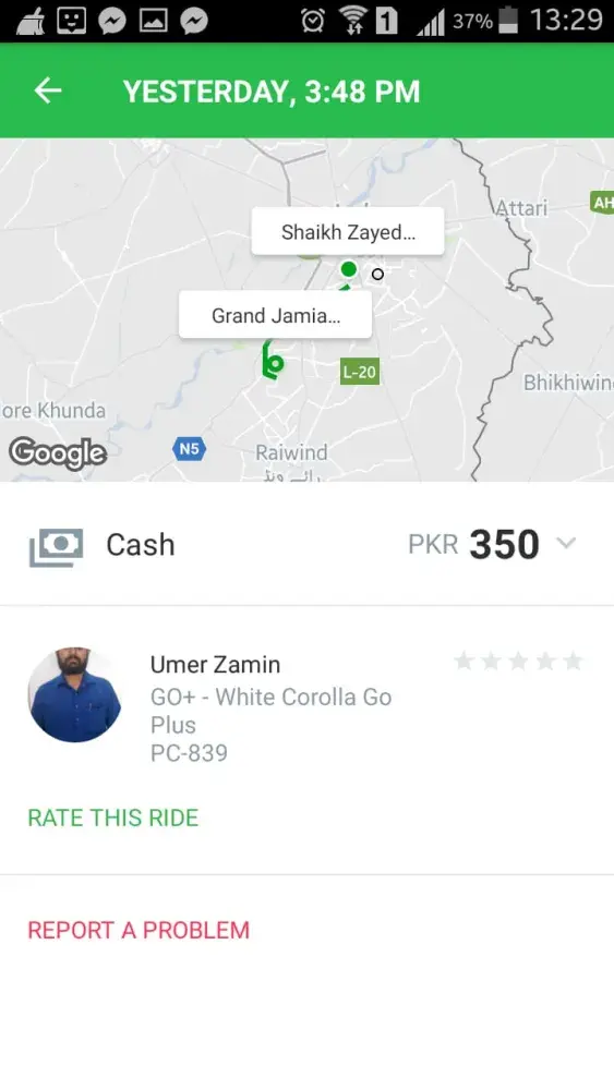 main ny kal(dt.25.09.18) sham (timing:3.48 pm) bahira town, lahore sy sheikh zayed hospital ky leey car pc -839(go+) book ki