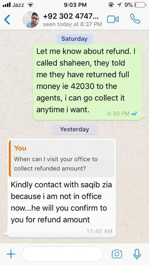 Mr. Shahid Sales Manager cell number [protected] UAN : [protected] and [protected] was saying that you have paid and let me inquire and I will issue your tickets and finally as on July 21, 2017 he said that the fares have gone high and he can’t do anything.