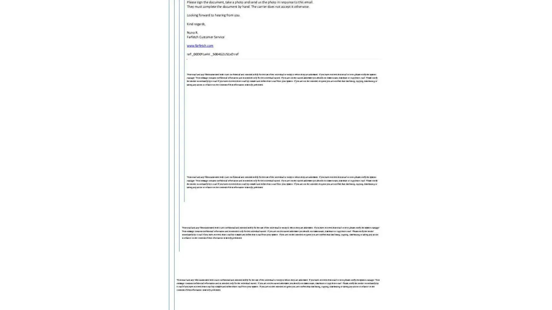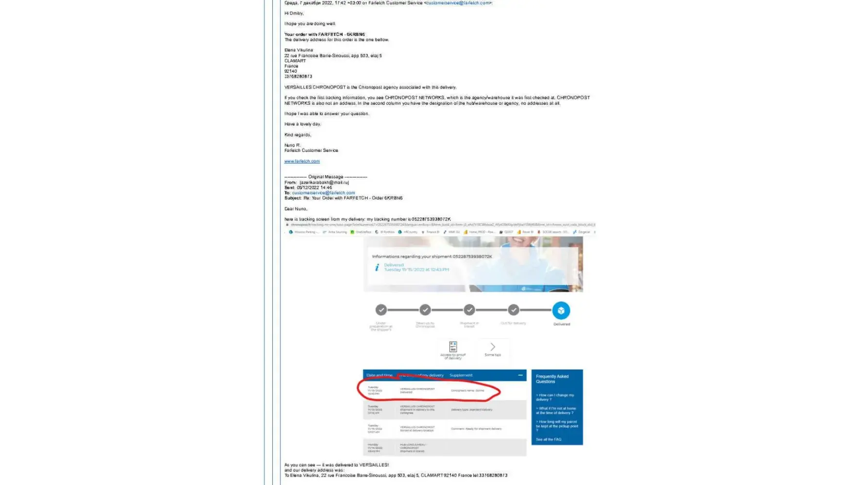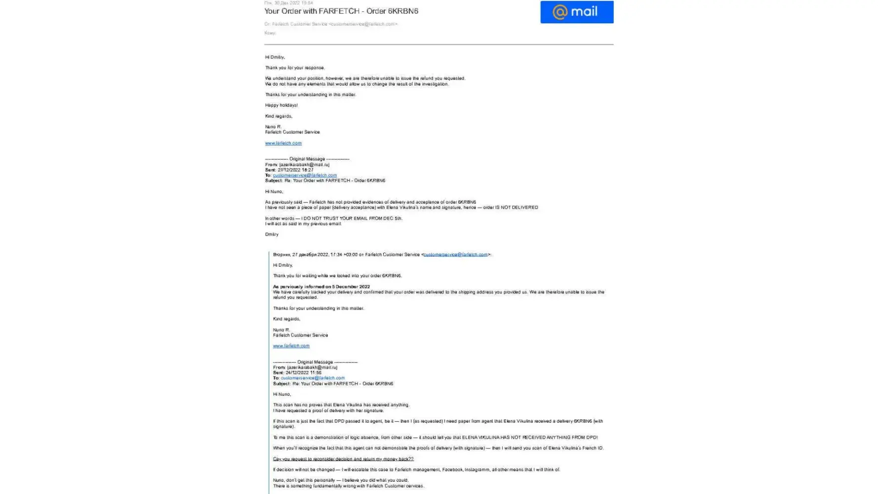 I was asking for a refund of funds, however Farfetch replied that delivery is made and refund is not possible. When I asked for a proof of delivery with signature of acceptance, Farfetch replied with document 4 which is complete nonsense as it has no proof of delivery and no signature of my wife.