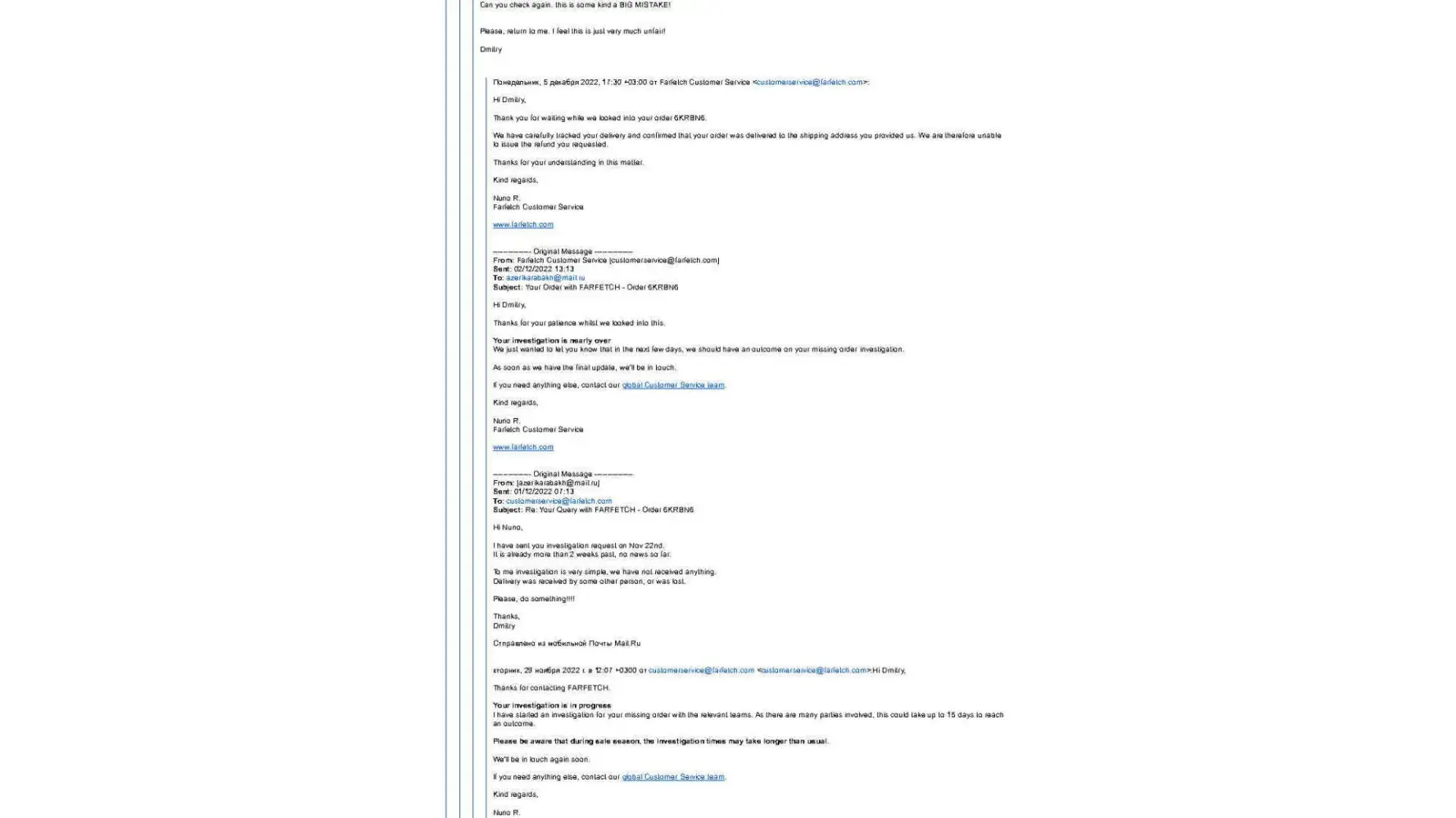 Overall, my experience with Farfetch Russia has left me with the impression that they don't care about their customers or their problems. If you're thinking about ordering from Farfetch, keep in mind that they may not be willing to help you if something goes wrong.