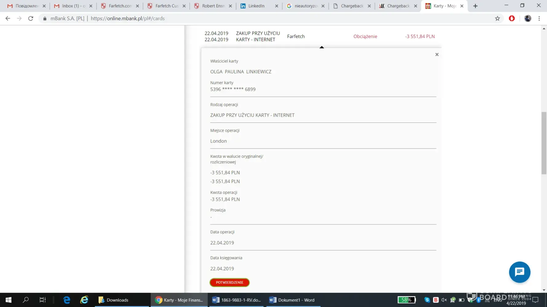 Yesterday (April 22) Farfetch charged my credit card 3817, 93 PLN which is roughly 717 GBP. I've never made any purchases at Farfetch. I suspect my credit card details have been stolen (probably in Lviv, Ukraine, where I was last week). I've already reported incident to the police. Please return the money to my account. Sincerely, Olga Linkiewicz