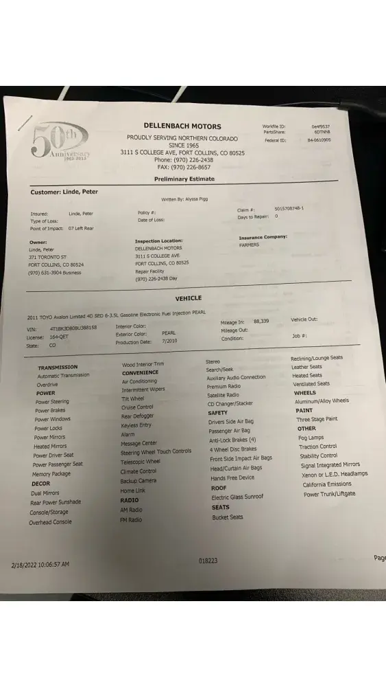 A couple weeks ago, someone hit my parked car. I got their insurance and started a claim. I would prefer to get a cash payment for the damage done. I filed a claim through their insurance and got an estimate from the body shop (Dellenbach Motors). The Insurance company said I had to do a virtual estimate through their app, so I did that as well and they provided an estimate.