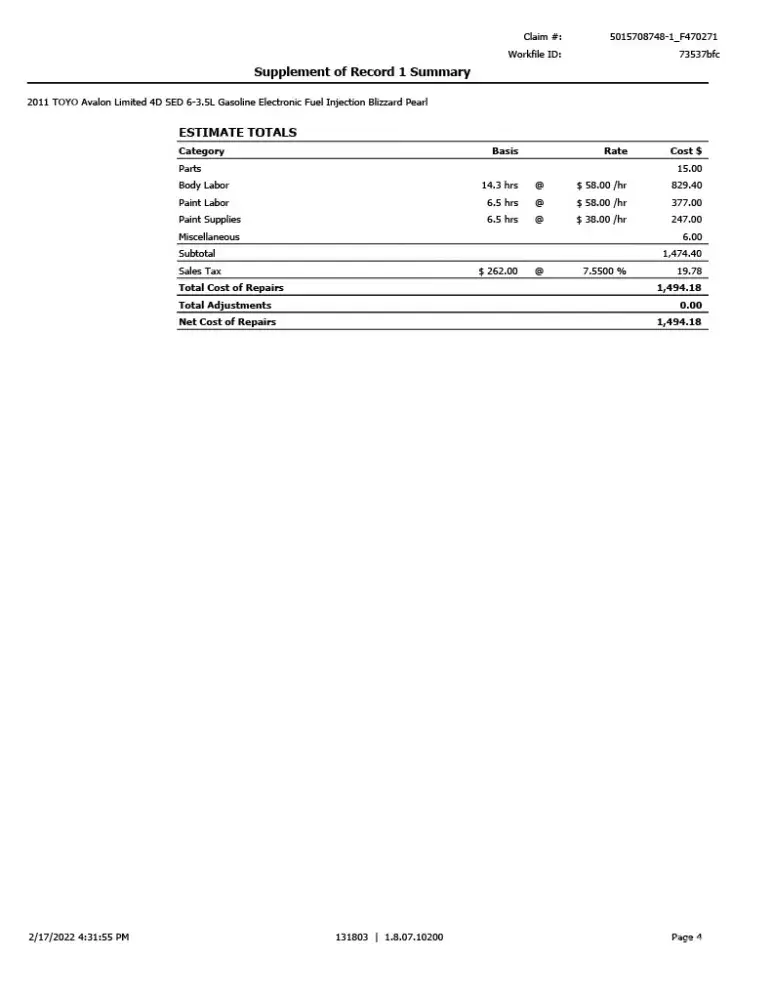 As I will most likely be repairing the car myself, I want an accurate estimation of the damage done for the cash settlement. Estimates from Farmers and the Body shop are attached.