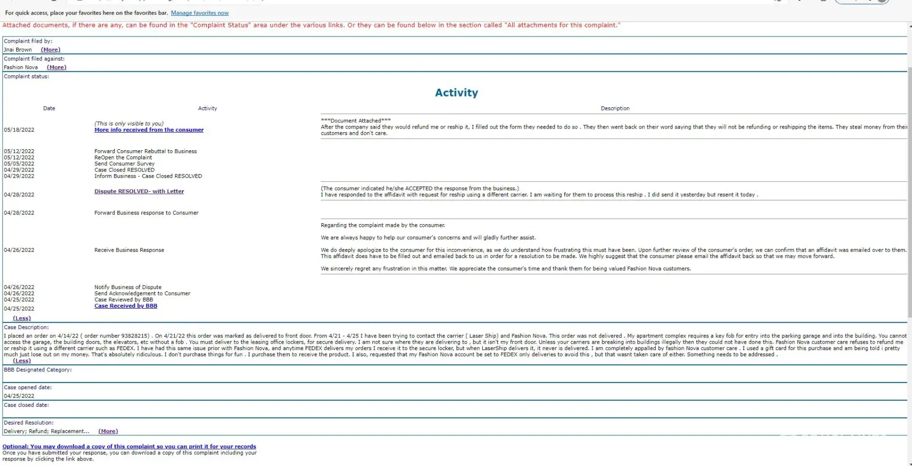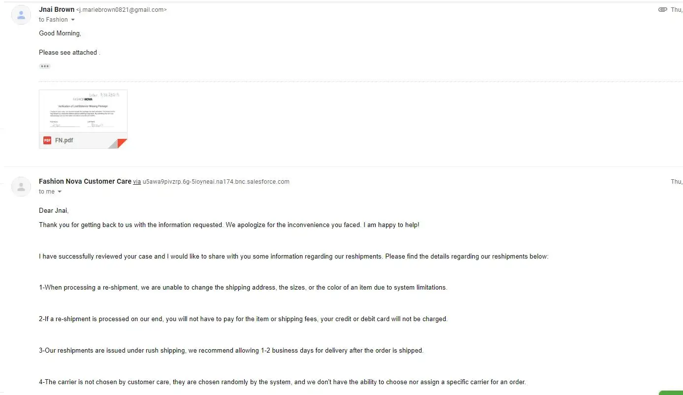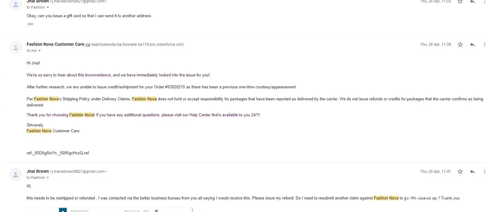 I placed an order on 4/14/22 (order number [protected]). On 4/21/22 this order was marked as delivered to front door. From 4/21 - 4/25 I have been trying to contact the carrier (Laser Ship) and Fashion Nova. This order was not delivered. My apartment complex requires a key fob for entry into the parking garage and into the building. You cannot access the garage, the building doors, the elevators, etc without a fob. You must deliver to the leasing office lockers, for secure delivery. I am not sure where they are delivering to, but it isn't my front door. Unless your carriers are breaking into buildings illegally then they could not have done this. Fashion Nova customer care refuses to refund me or reship it using a different carrier such as FEDEX. I have had this same issue prior with Fashion Nova, and anytime FEDEX delivers my orders I receive it to the secure locker, but when LaserShip delivers it, it never is delivered. I am completely appalled by fashion Nova customer care. I used a gift card for this purchase and am being told I pretty much just lose out on my money. That's absolutely ridiculous. I don't purchase things for fun. I purchase them to receive the product Something needs to be addressed. I wrote into the Better Business Bureau and I was told I would be receiving a refund or reship if I sent in a form. I did the form and now they are refusing to resend my product or reship it, AND ARE NOW IGNORING MY EMAILS. this is is unprofessional.