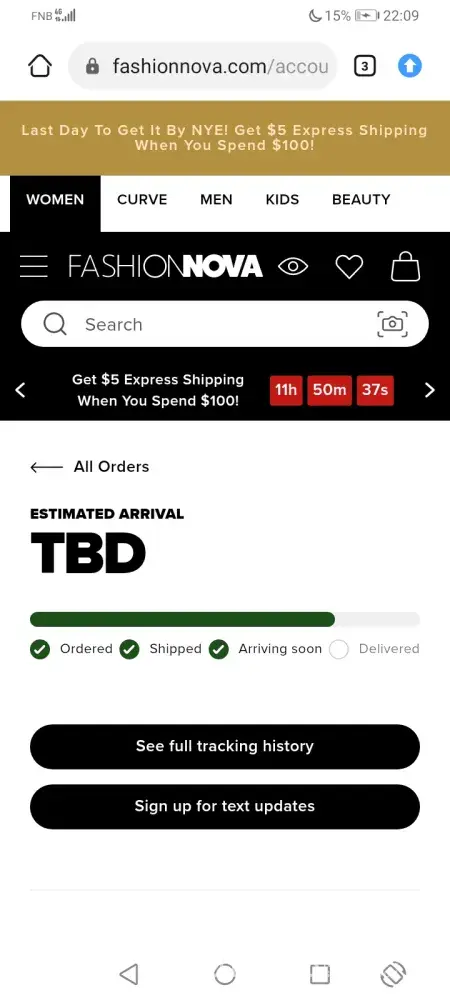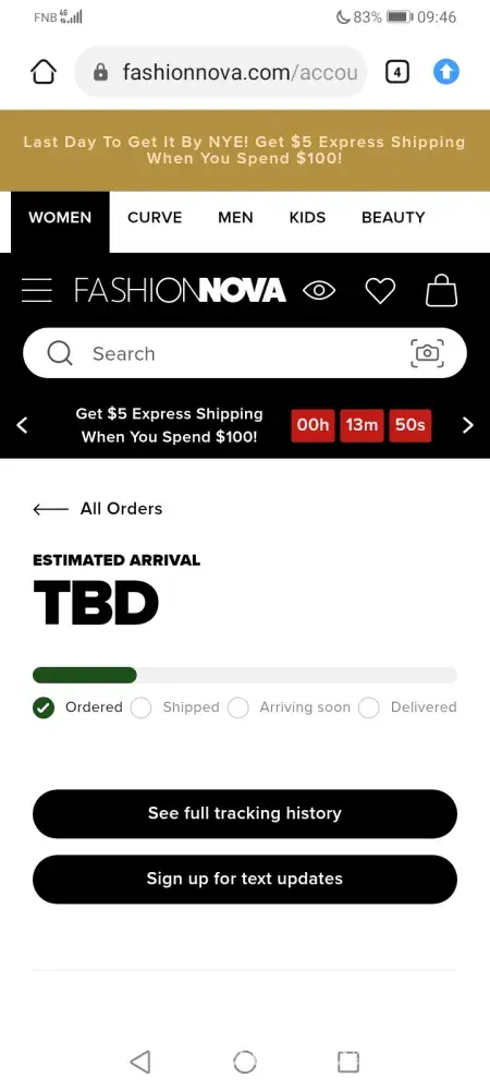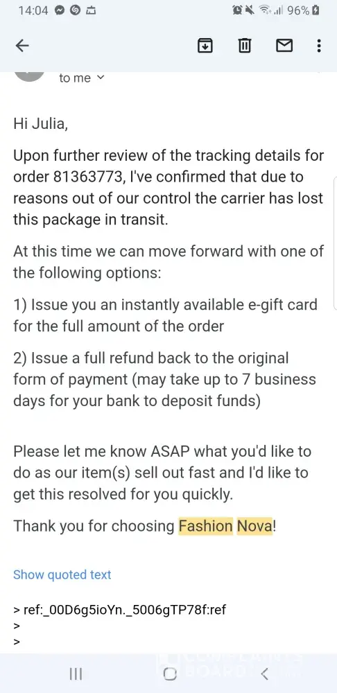 I ordered from FashionNova's website, Got express shipping, didn't come when it was supposed to so they refunded me my shipping cost which was great. Now it's been over 3 weeks still no package, no updates and nobody from customer service is emailing me back. Which I find funny because they were so responsive up until they date they gave me which they'd start the refund process.