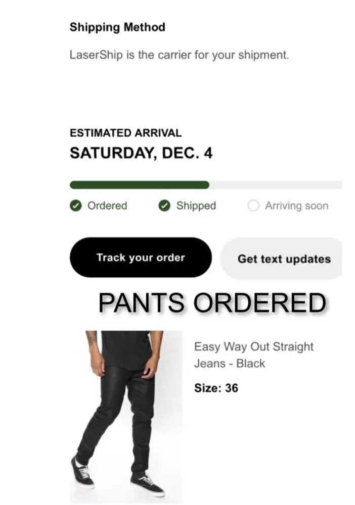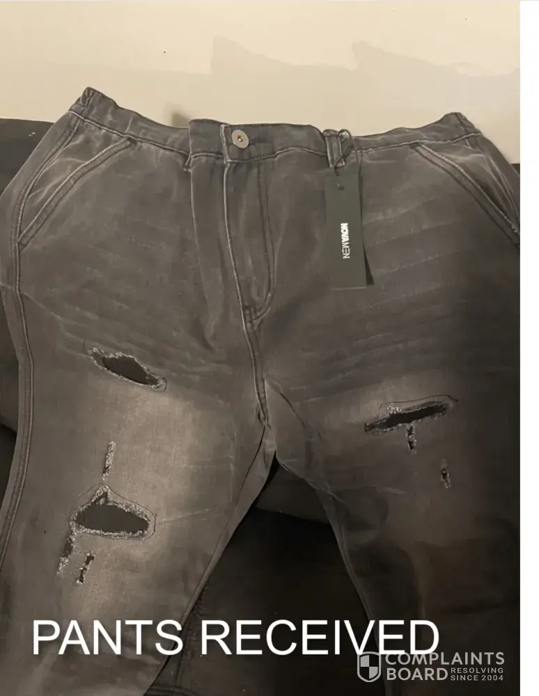 I received my order and they sent the wrong pants. Sent customer service the photos of the pants I received vs the pants I ordered in my order confirmation email WHICH ARE VERY OBVIOUSLY NOT THE SAME PANTS. Do you see rips and distressing on the pants in my order confirmation? NO! The pants I ordered are solid black. Totally different item from the faded gray jeans with rips I received. Looks like at the time your website was posting pictures of the wrong item. Please send me a prepaid shipping label so I can return the wrong item received. I am not paying to send it back as this was an error on Fashion Novas part.