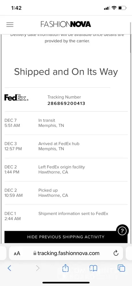 My daughter made a online purchase with Fashion Nova she has yet to receive it. She was keeping up up with the shipment because the clothes were for a trip that she planned for her college graduation out of the country. She received an email about the shipment of the package on December 1, 2021 saying shipment information was sent to FedEx, on 12/2 picked up at Hawthorne, CA and left Hawthorne, CA by FedEx. December 3, 2021 arrived at FedEx hub in Memphis, TN and on December 7, it says in transit and nothing after that. She tried to reach out to Fashion Nova with no response so she filed a claim with FedEx not feeling like it was you guys fault because you did your part and shipped the merchandise, so she filed a claim with FedEx being that the merchandise was in their possession. They denied the claim because they are telling us that we the shipper must file all claims as per their contract agreement with Fashion Nova and told us to contact the shipper for further information. It is impossible to speak with anyone at Fashion Nova so we have been emailing since this started. This is too much money to ignore the situation and to not be able to speak with anyone is just nerve racking. PLEASE RESPOND!
