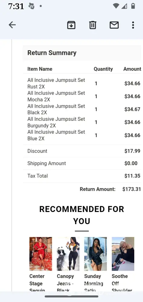 My name is angela Davis I ordered a sweat suit but it was to big so I went to the postal service office and sent it back and waiting on my refund I sent it back11/20/2021 and I have a tracking number it says it's been delivered i still owe them 28.49 but I been sent that sweat suit back they owe me56.49 my email is angela.[protected]@yahoo.com I just want my refund back I will never buy anything from them they or bad business