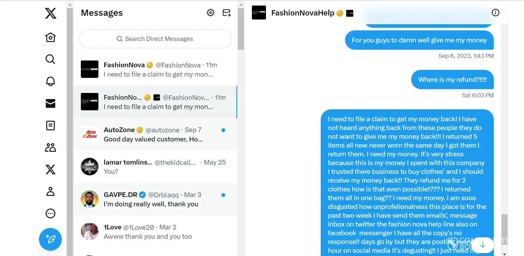 I need to file a claim to get my money back! I have not heard anything back from these people they do not want to give me my money back! I returned 5 items all new never worn the same day I got them I return them. I need my money. It's very stress because this is my money I spent with this company I trusted there business to buy clothes' and I should receive my money back! They refund me for 2 clothes how is that even possible!? I returned them all in one bag? I need my money. I am sooo disgusted how unprofelionalness this place is for the past two week I have send them emails', message inbox on twitter the fashion nova help line also on facebook messenger I have all the copy's no response! days go by but they are posting every hour on social media it's degusting! I just need my money back at this point thats it. I am done! It's very draining when you have no help in getting your money back that you worked hard for. I'm disgusted! I have send emails and emails and messages I mean Jesus! This is the worst! I have all my proof as well.