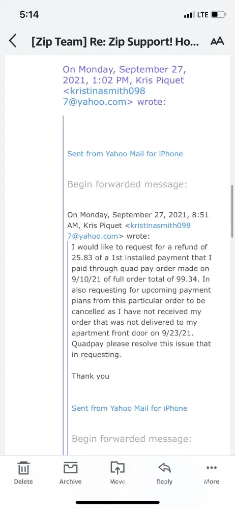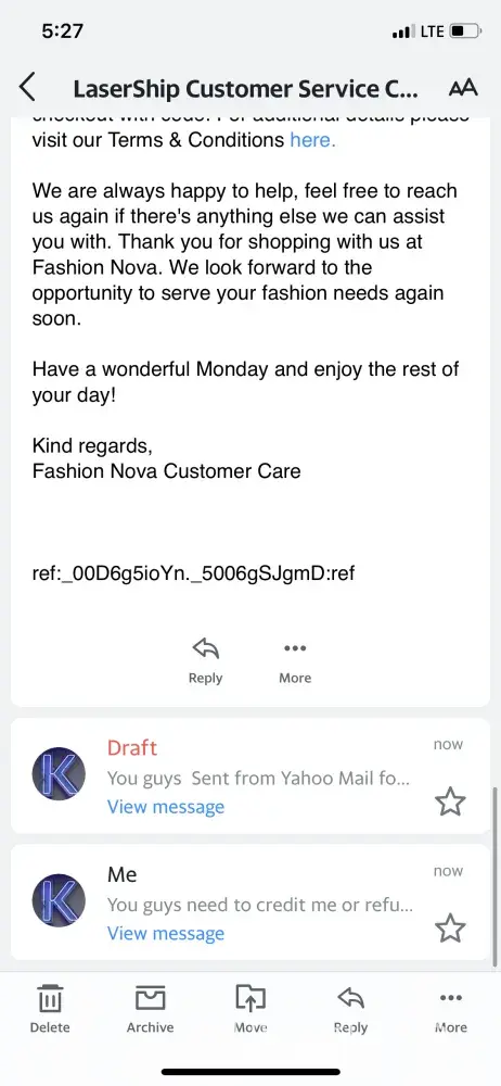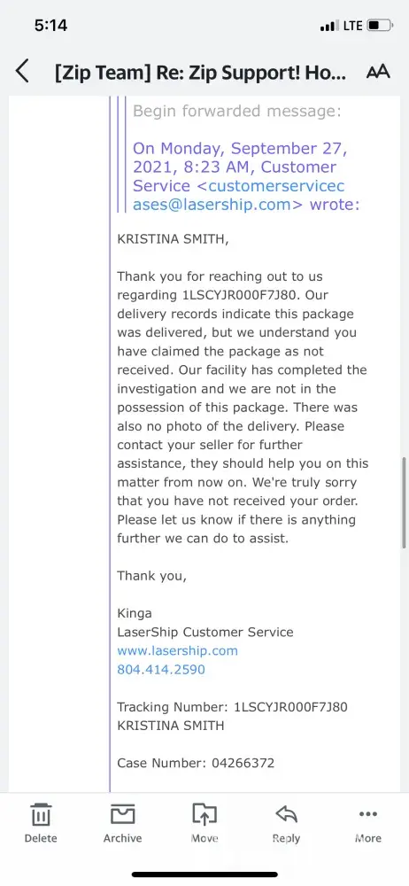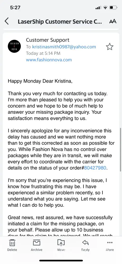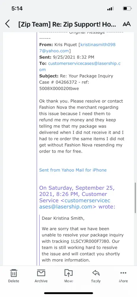 I placed an order through Fashion Nova in 9/10/21. On 9/23/21 I received an email from Fashion Nova that my order was delivered and I did not receive it. I contacted shipping carrier laser ship for them to investigate where my package was. I had not heard back in a couple of days. I called and spoke with a customer service representative named Kings that I advised me that my package could not be found. She emailed me proof and I sent the proof to [protected]@fashionnova.com and they advised me that there is nothing they can do to either refund me my money back, provide me a store credit, or simply reship my order. They did not want to assist me. I needed the items so much that I replaced the same order on 9/23/21, the day that my 9/10/21 order was supposedly delivered to me on 9/23/21. My apartment leasing office manager dud not retrieve my package from the leasing office, mon of my neighbors, or even the msil man did not have my package. I placed my order through Quadpay and fashion nova and Quadpay could mig refund me my money because fashion nova would not refund them their money from me arranging a payment plan through another pay source gFashion Nova uses called Quadpay. I need a resolution regarding please assist. This is all I ask.