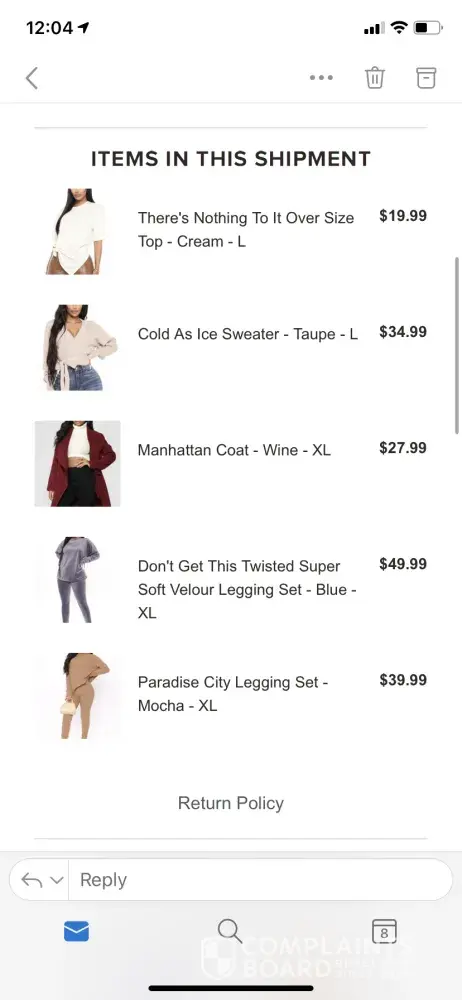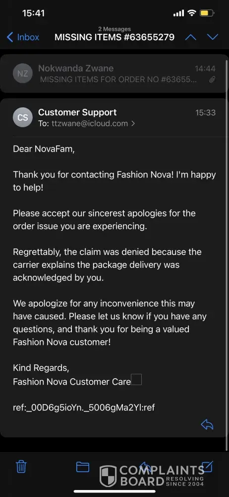 my order states it was delivered, yet I never received my items. I reported the issue. They apparently investigated and determined that since it said it was delivered, they were not going to resend or refund the items. I am basically out $269.99! What a ripoff. Just because an order says delivered, that does not mean the consumer received it. There should be some safegaurds in place to make sure that consumers aren't taken advantage of. This is not a small order. I trusted Fashion Nova with my hard earned money, and they basically laughed in my face at my complaint. They deserve to go out of business!