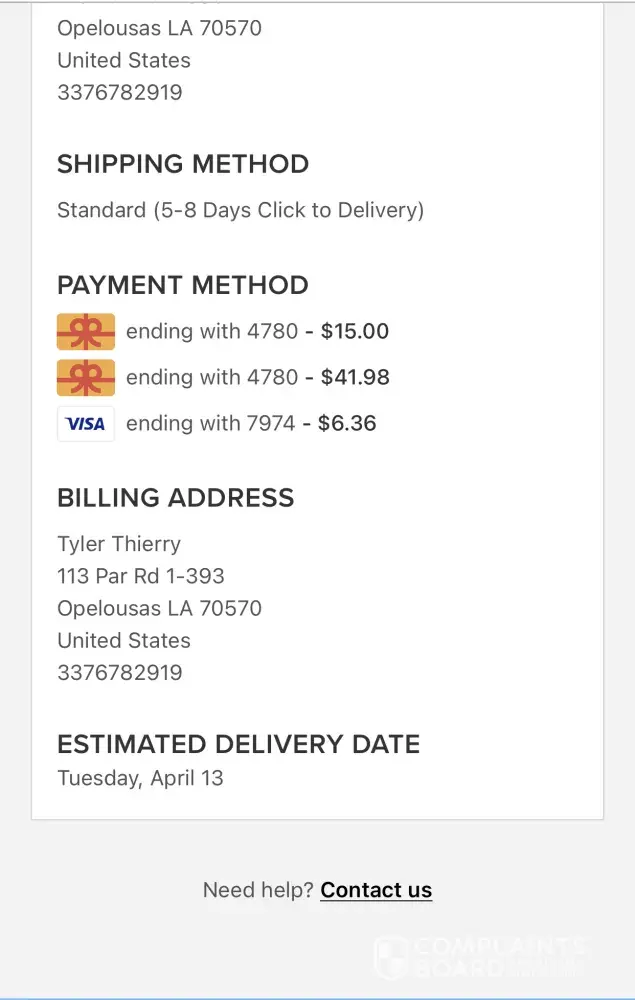 have no revived my order it was sent back and they do not want to send me my refund I've asked several times they know it was sent back and they are trying to give me an e card which I will not accept . I told them I will be contacting FTC.gov and also someone else who could help me with this . I do not want to take it that far but I definitely will I just want my refund that is it . The clothes were sent back the least you could do is send my money and cancel the order