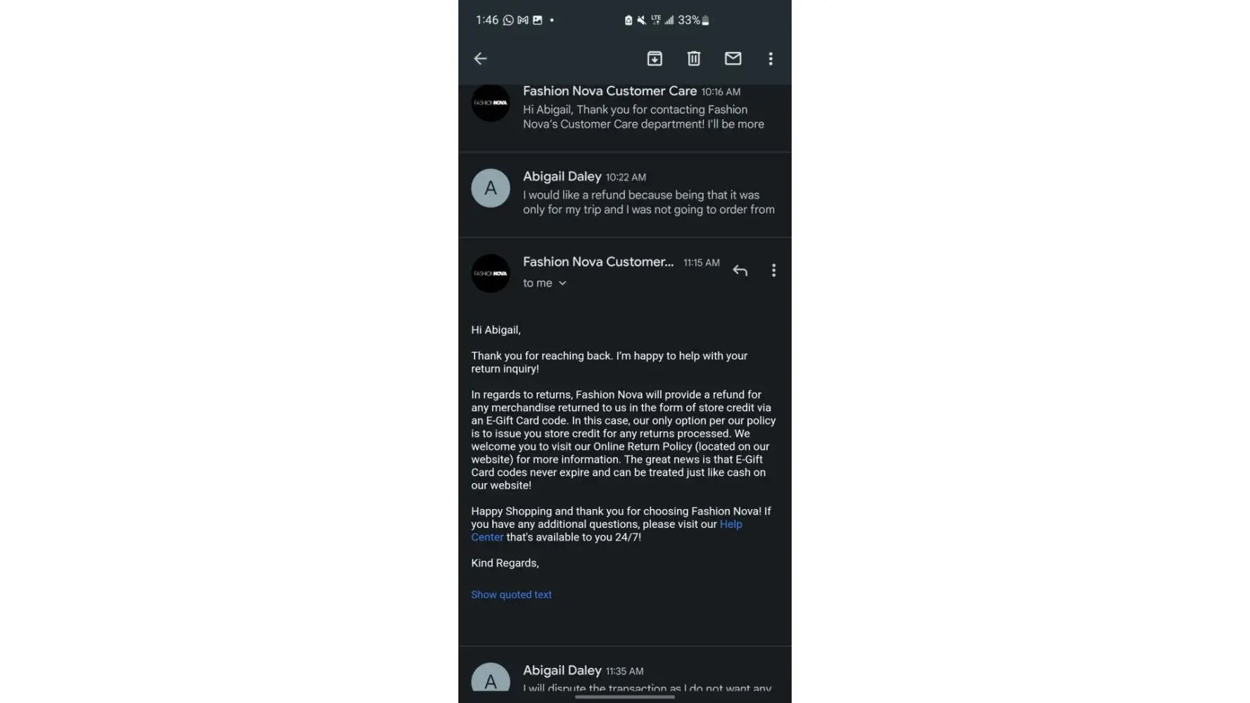 I reached out to fashionnova asking for them to reimburse my card for the items I returned. They kept sending me random automated emails.