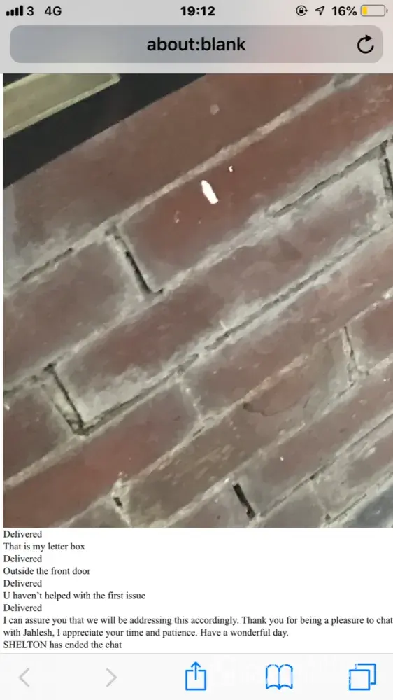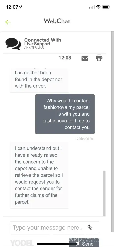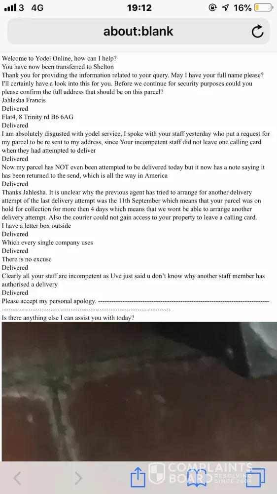 Whilst pointing out all the errors Yodel had made, the adviser "Shelton" attempt to dispute the delivery drivers could not access my building, which is why they did not leave a calling card. I then went on to state my postbox is outside, right next to the door and proceeded to take a picture and sent it to Shelton. But rather than attempt to rectify the situation Shelton abruptly ended the chat, which led me to go to the depot the next day, I spoke to the manager who told me had the issue been rectified the day before by Shelton, my parcel would not have been in transit back to the sender.