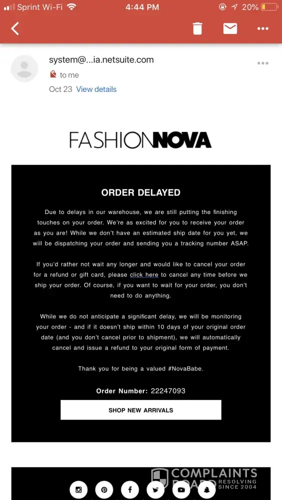 I recently ordered from fashion nova for a Halloween costume that I rushed and paid for two day shipping since I ordered on the 16 of October and had a Halloween party to attend the 27th they never gave me a conformation email or tracking number so when October 22 came I started to panic I got ahold of them and canceled my order because they posted about a ten day delay and I didn't think I was gonna receive my costume in time I finally got told my refund was being processed after several days and several emails later only for them to still ship my item that I already canceled and now will not accept it back due to Halloween costumes all of a sudden becoming a final sale I have pictures to prove them excepting my refund request and now being told I can not get one after I already went out and bought a new costume for the party I am highly pissed and will never shop fashion nova again it has been more Hassal than anything!