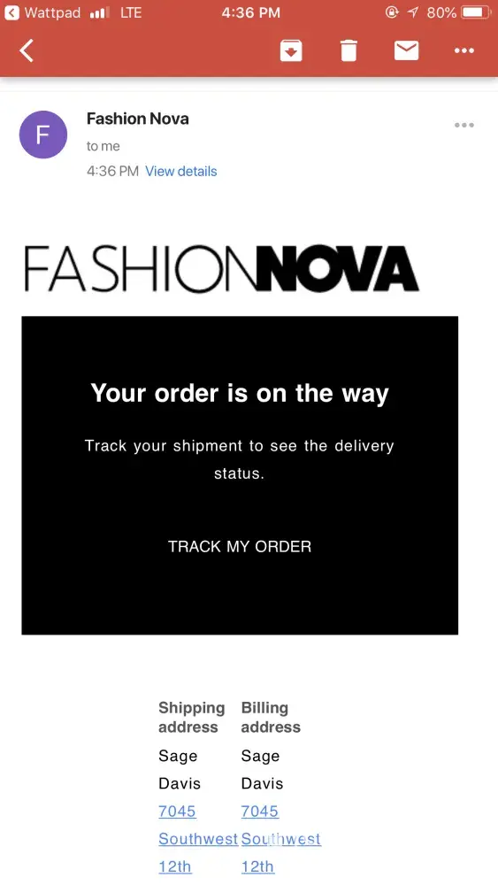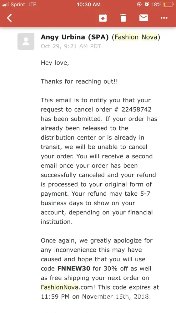 I then reached out to FN support to confirm cancellation and received email confirmation on October 29 from Kevin C. (I would write his last name but it's not fair that an entry level rep gets called out by full name when it's really just Fashion Nova being a [censored] show of a company).