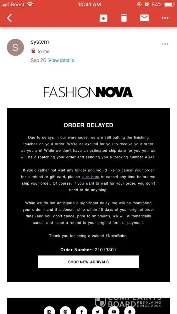 I'm definitely disappointed in fashion nova, to where I would literally never buy from them again . I ordered items, paid for 2 day shipping. Items weren't shipped out until a week later . But this time, I just wanted to cancel . I received an email stating that the items were delayed I asked for my money back. Never got it back. And I've been calling and emailing. If I chose that option, why can't you give me my money back . I still have gotten my items . It's 10/04 . This is unacceptable and very unprofessional and I'm furious that I have to go through this ! I still have my screen shots of my emails and my call logs of me trying to get help . I'm beyond pissed! Worst experience EVER !