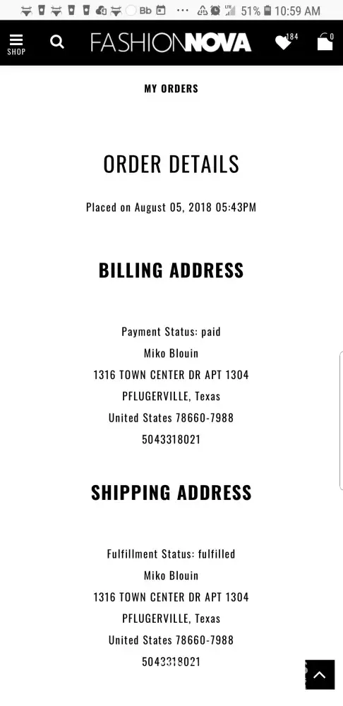 I purchase goods/products online all the time and I have never had such an appalling experience: waiting so long to receive an order, providing out of date tracking information and poor customer service from Fashion Nova.