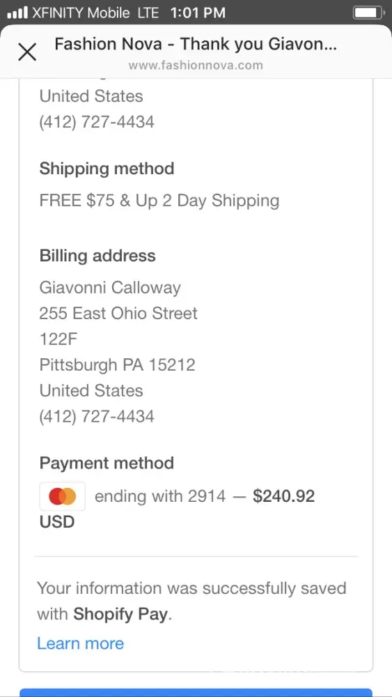 Fashion Nova did not honor next day shipping after accepting payment for it. I should not have to wait 1-2 business days for correspondence about product that I payed to have next day. All the reviews are absolutely correct and the false advertising is unfair to customers. They have given no no further information about my order status or if I will receive a refund