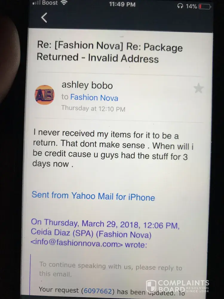 On March 19th 2018 I Purchased a order for $214.11 order number #[protected] tracking number #9405510205369032711676 and I NEVER recieved it for 3 days it stayed in the same one place in Los Angeles so after 2 times of emailing them 3 days later they messaged me back and said my order has been shipped back to them and that I will be credited but after 2 days I emailed them again and they Never replied back it is now April 3rd 2018 and I still haven't heard from them and I messaged them 3 times since then .i ordered from them multiple times this was my biggest order that I ever did and that was first time I ever experienced this with fashionNova I even tried to call the number that I searched for registered for them and I still didn't get no where with that number .My name is Ashley Bobo my email is [protected]@yahoo.com and phone number [protected]
